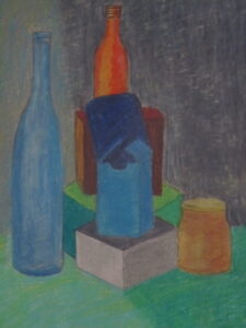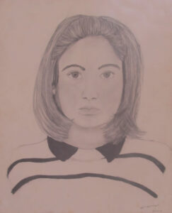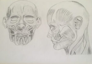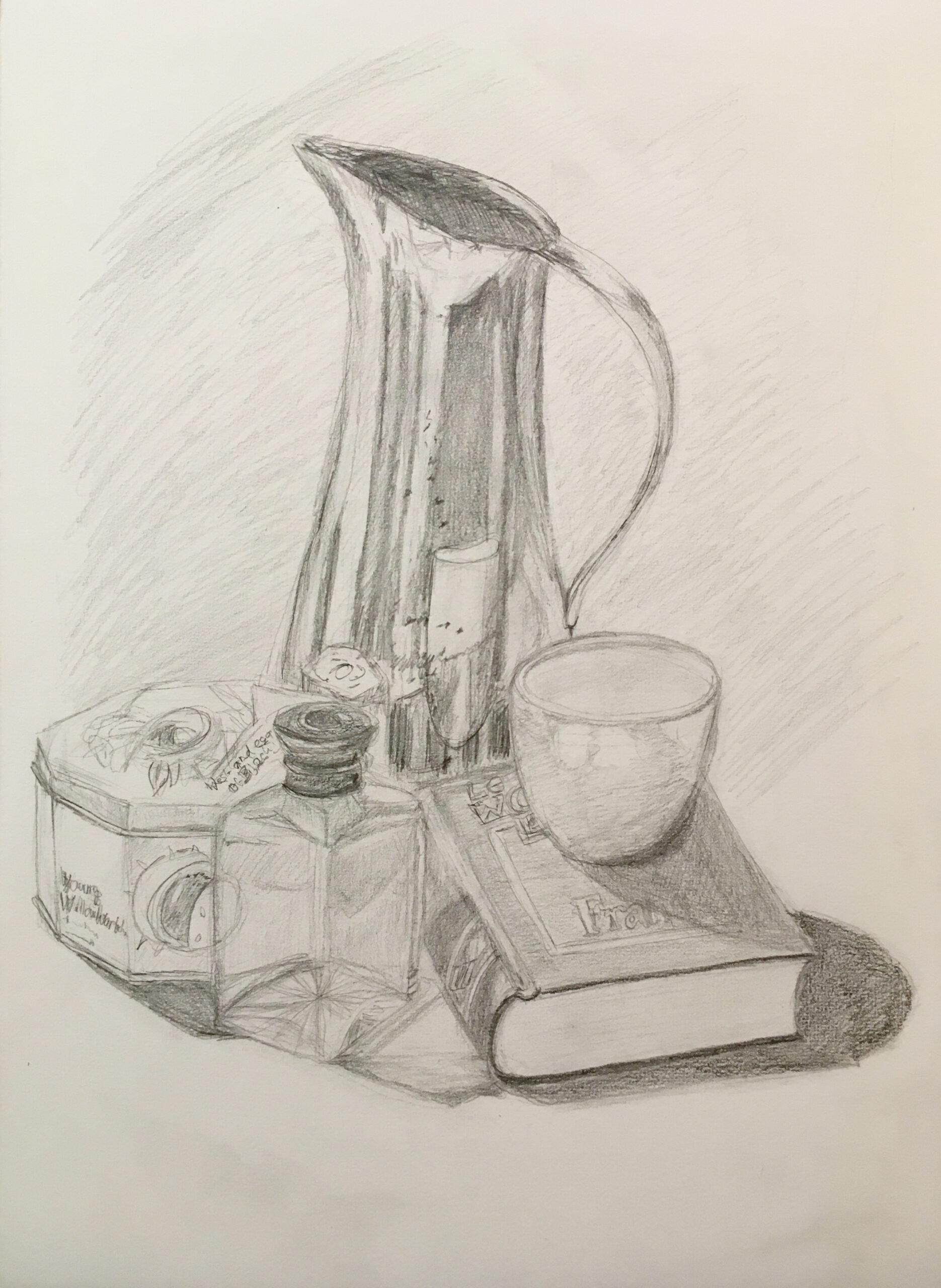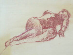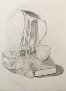 Zelfporter c.a. 1990Mijn woonhoekschedelshoofd-spierstelselZelfportret 1987 in houtskoolNaakt liggend model contéStilleven met zilveren kan, grafietpotloodPotlood, houtskool en conté-schetsenZelfportret april 2023